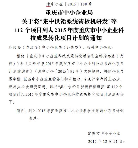多年以來,重慶城建經(jīng)濟(集團)重慶綠色科技開發(fā)有限公司與重慶房地產(chǎn)職業(yè)學(xué)院進行產(chǎn)學(xué)研合作,堅持創(chuàng)新發(fā)展,研發(fā)了“中國創(chuàng)造”“互聯(lián)網(wǎng)+多色溫防霧霾亮度可調(diào)智能控制系統(tǒng)及LED智能燈具”技術(shù)。該技術(shù)自2015年7月22日申報2015年度重慶市中小企業(yè)科技成果轉(zhuǎn)化項目計劃后,現(xiàn)已于2015年12月21日成功列入科技成果轉(zhuǎn)化項目計劃。通知文件如下: