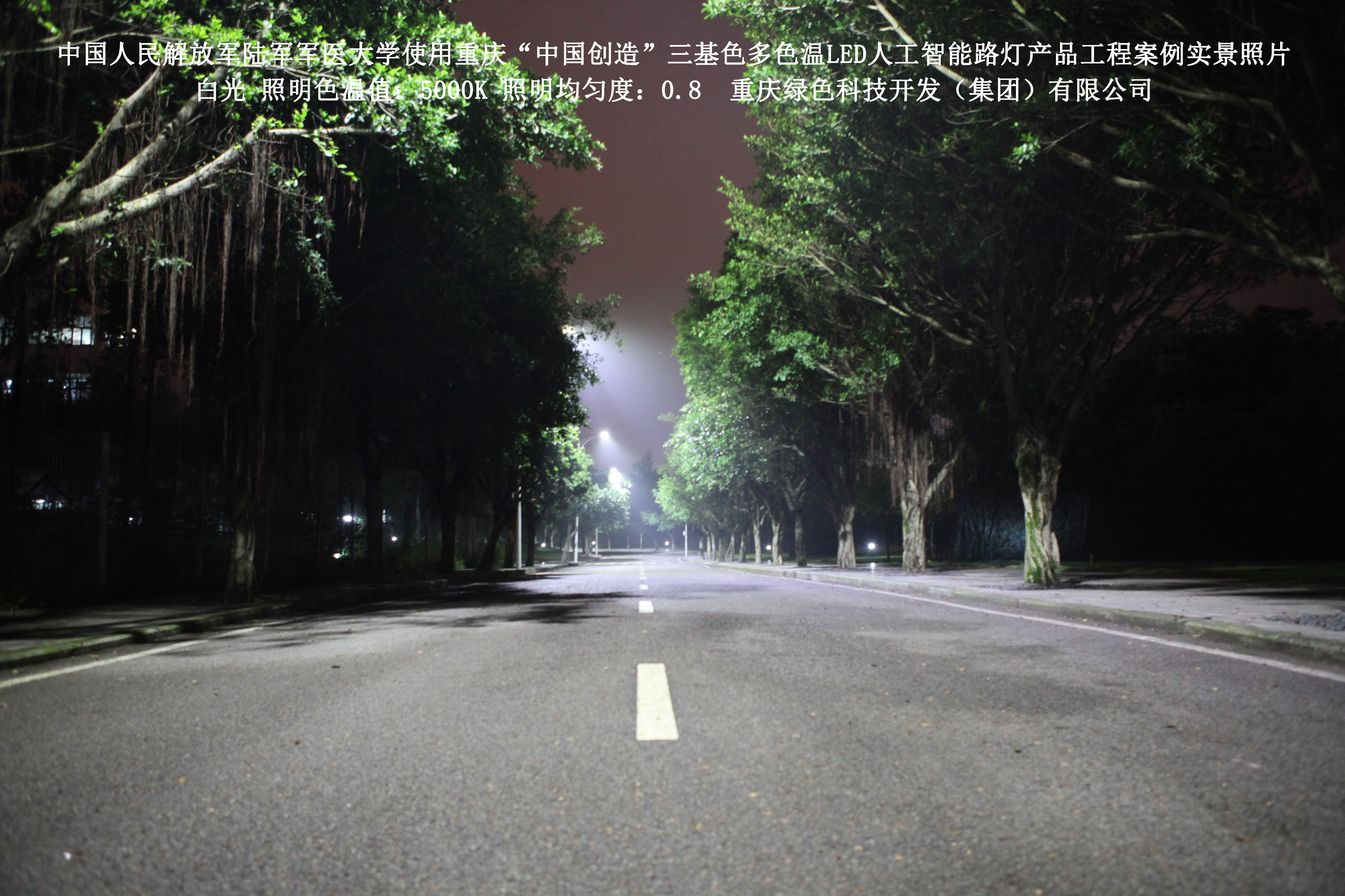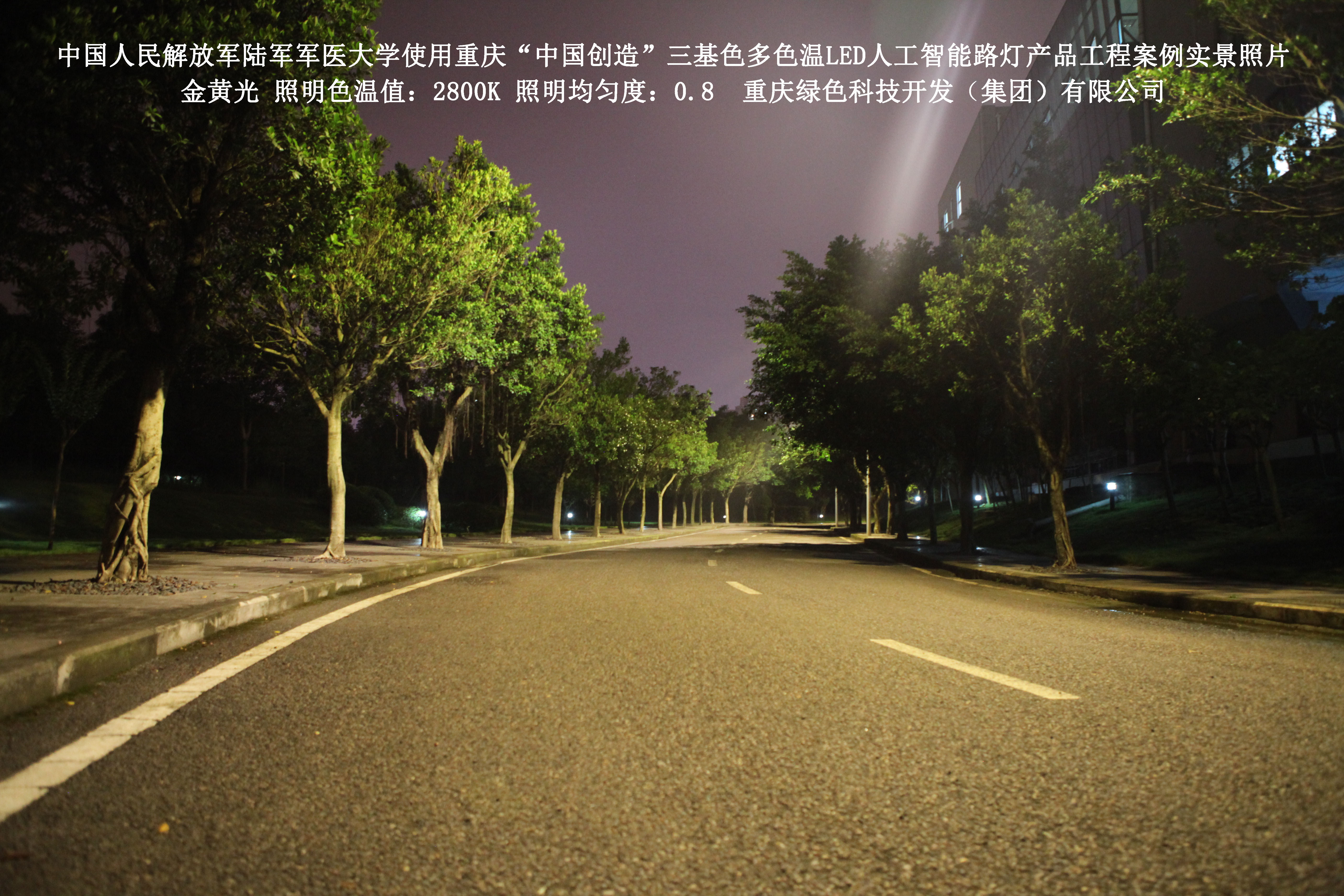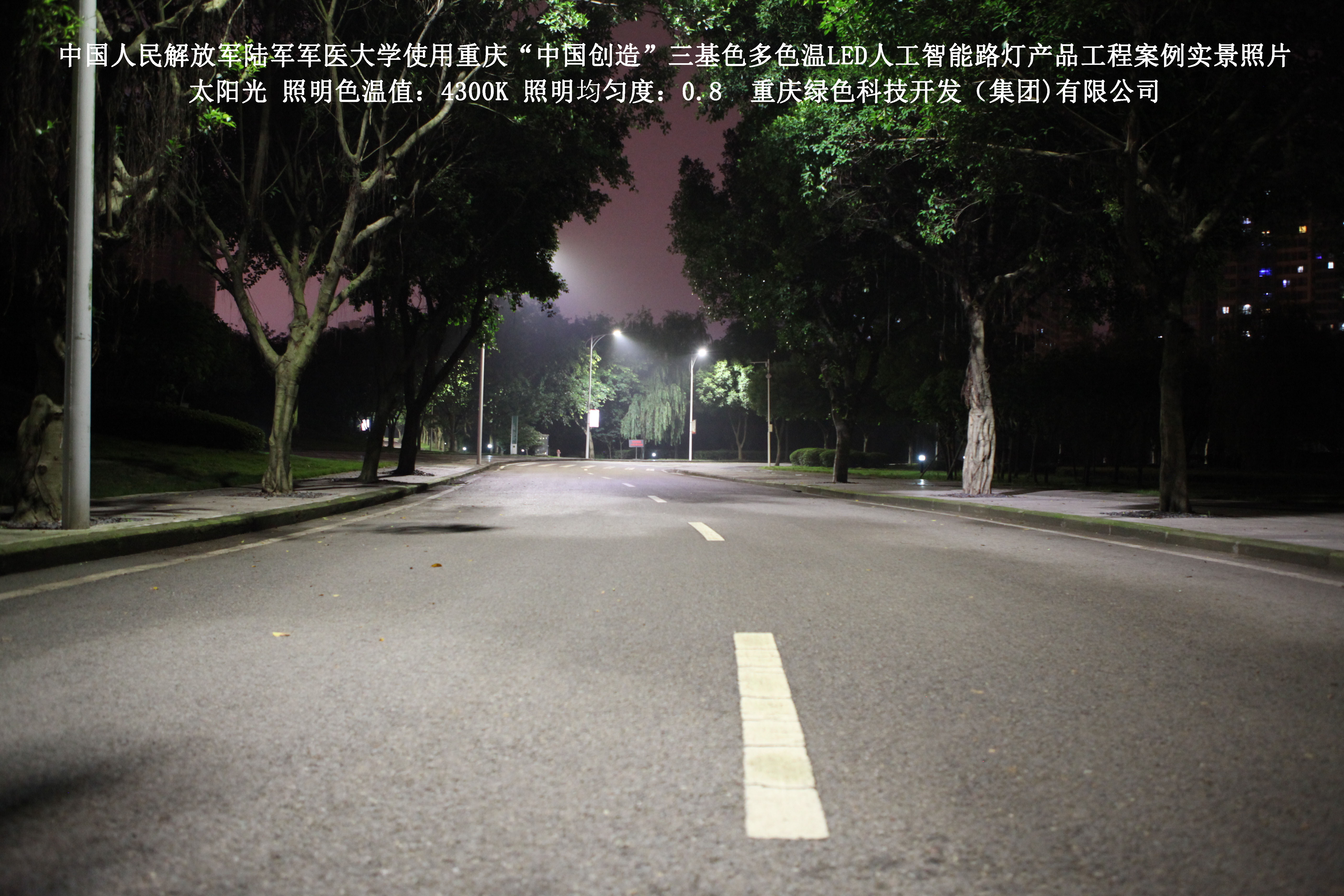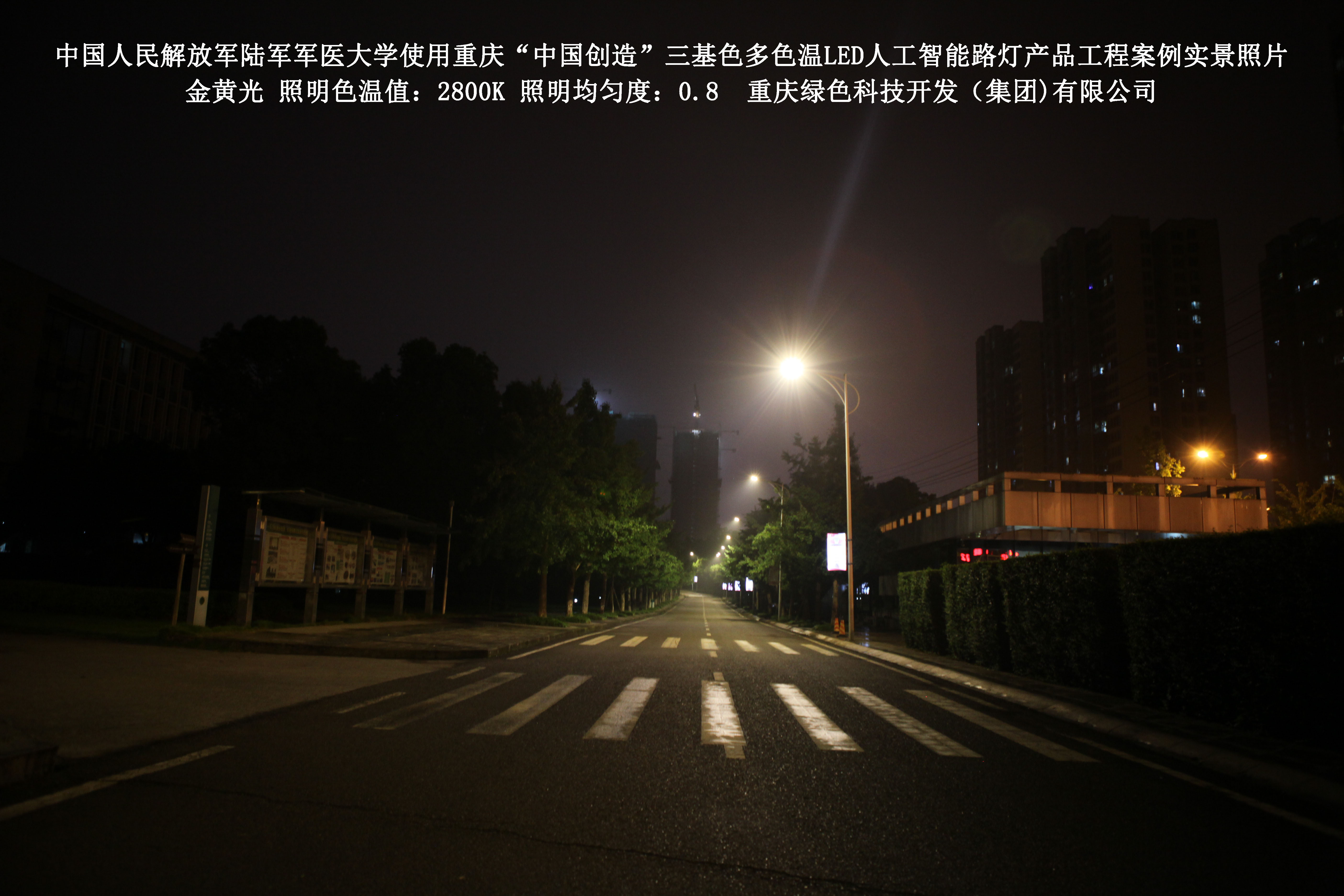 2018年4月,中國人民解放軍陸軍軍醫(yī)大學(xué)使用了我司研發(fā)制造的重慶“中國創(chuàng)造”三基色多色溫LED人工智能路燈,對沙坪壩大學(xué)城校區(qū)道路實(shí)施了綠色照明科技節(jié)能改造工程,該工程已全面竣工。工程實(shí)施后,極大地提高了照明清晰度、燈光均勻度、舒適度,實(shí)現(xiàn)城市路燈照明系統(tǒng)的智能化管理。
